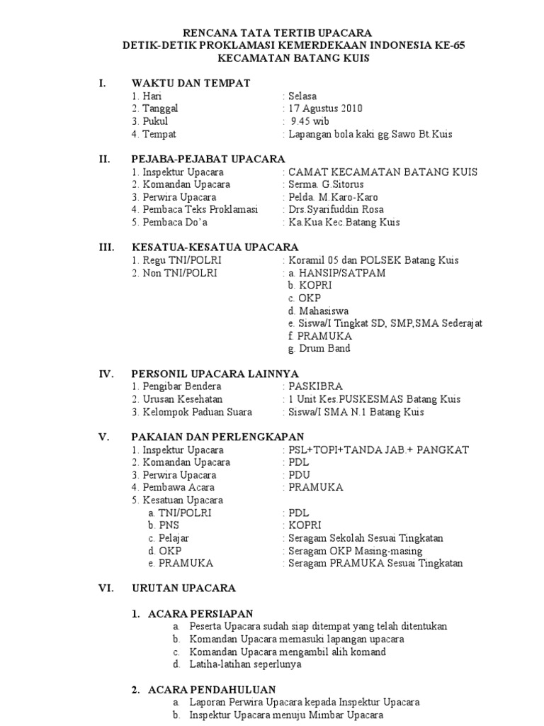 Republik indonesia tanggal 17 agustus tahun. Berikut adalah contoh susunan acara upacara untuk 17 agusutus. Sebagai bangsa indonesia maka peringatan hari kemerderkaan 17 agustus perlu dilaksanakan salah satunya adalah dengan upacara bendera 17 agustus susunan tata upacara bendera pada tanggal 17 agustus sangatlah berbeda dengan upacara bendera biasa misalnya upacara hari senin di sekolah baik di sd smp maupun sma atau di lembaga lembaga lain baik sipil maupun militier.