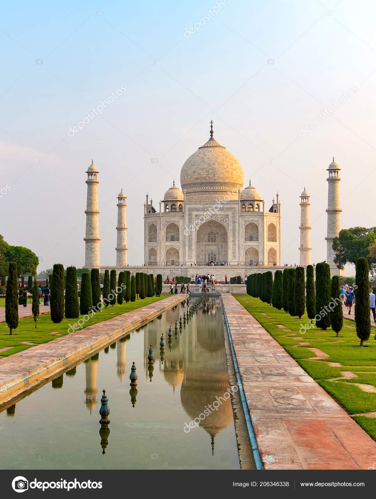 Front View Of Taj Mahal With Water Channel Lined With Trees Stock